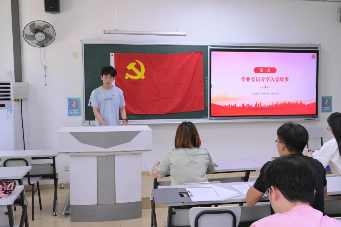 在榜样分享环节中,毕业生党员代表何经纬深情分享了个人入党初心与成长感悟。他讲述了儿时红色家风和先辈事迹在心中播下信仰种子的历程,以及在志愿服务和社会观察中,深刻领悟党的宗旨价值,坚定入党信念的人生选择。何经纬分享了他进入大学后始终以党员标准严格要求自己,在学业钻研、问题解决、科研探索及志愿服务等各方面积极发挥先锋模范作用的实践经历。他回顾了面向党旗庄严宣誓时,这一重大身份转变的光荣时刻,并深刻阐述了“组织上入党一生一次,思想上入党一生一世”的核心认识,强调了党员身份背后的神圣责任与终生修行。他表示将继续永葆初心,在党和人民需要的地方践行使命担当。何经纬同志真挚地分享,生动展现了青年党员思想淬炼与行动的成长之路,为支部全体党员提供了学习的榜样和深刻的初心教育。