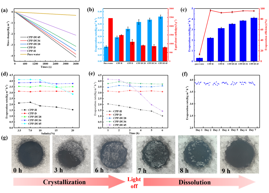 利用超声波辅助定向冷冻制备的水凝胶在太阳能驱动下表现出卓越的蒸发性能。在一个太阳光强度条件下,蒸发速率高达3.85 kg/m²/h,蒸发效率达到92%。即使在20%的高盐度条件下,该水凝胶蒸发器也能稳定运行,蒸发速率提高了23%。