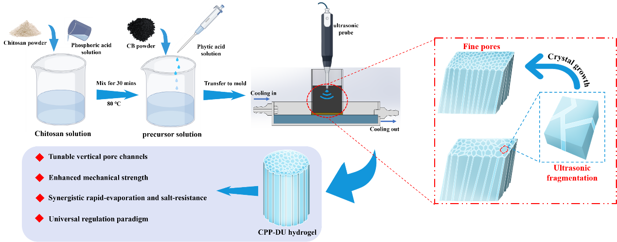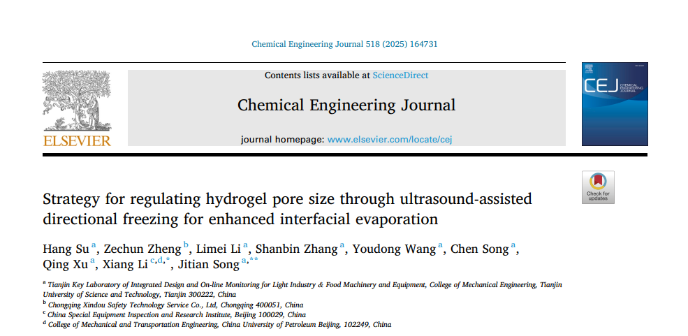 近日,304永利集团官网入口宋继田教授、徐庆教授团队在工程技术TOP期刊《Chemical Engineering Journal》发表题为“Strategy for Regulating Hydrogel Pore Size through Ultrasound-Assisted Directional Freezing for Enhanced Interfacial Evaporation”的研究性论文。宋继田教授课题组长期专注于液体食品与生物物料热力蒸发浓缩技术及装备研发。本研究在课题组原有研究基础上,实现了热力蒸发与光热蒸发的结合与创新突破,为液态食品的蒸发浓缩过程提供了新的技术思路与解决方案,展现出广阔的应用前景。304永利集团官网入口宋继田教授为通讯作者,304永利集团为第一作者单位。