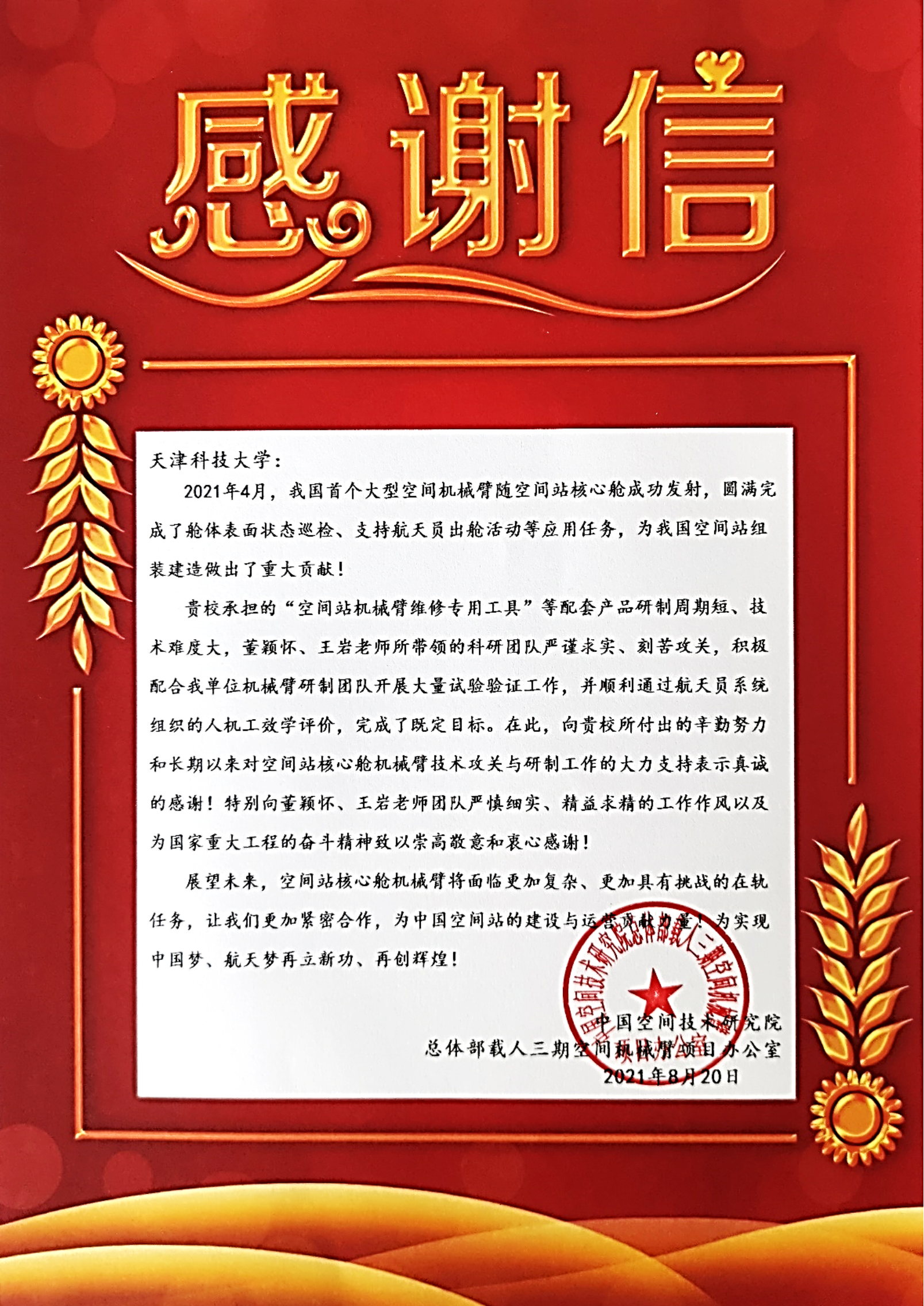 近日,在我国首个空间机械臂随空间站核心舱成功发射之际,中国空间技术研究院总体部载人三期空间机械臂项目办公室给公司发来感谢信,感谢304永利集团官网入口董颖怀,王岩老师带领的精密与特种加工研究团队为“空间机械臂维修专用工具”等配套产品的成功研制所做出的贡献。