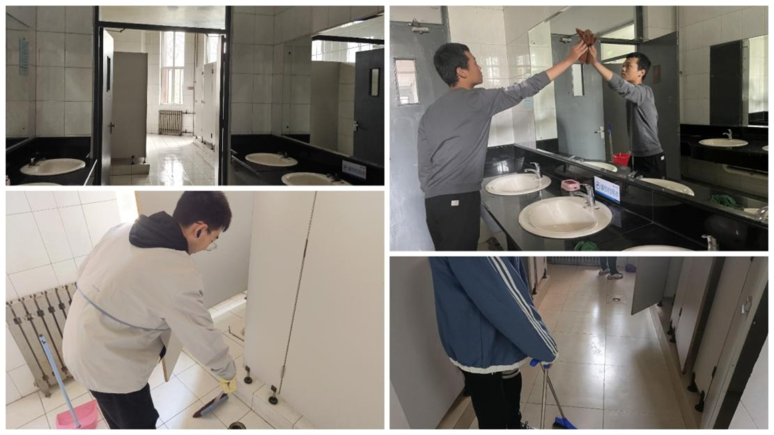 大家分工明确,配合默契,各就其位,流水作业,劳动虽苦,却也乐在其中。劳动氛围热情似火,劳动情绪斗志昂扬。汗水挥洒伴随时间的流逝,沉浸式的工作使同学们忘记了时间。当其他同学从走廊进入卫生间门的一刹,整洁程度让人眼前一亮,地面反射着窗外的阳光,镜子光洁如新,一个个角落似乎都一尘不染,这便是同学们努力劳作的成果。