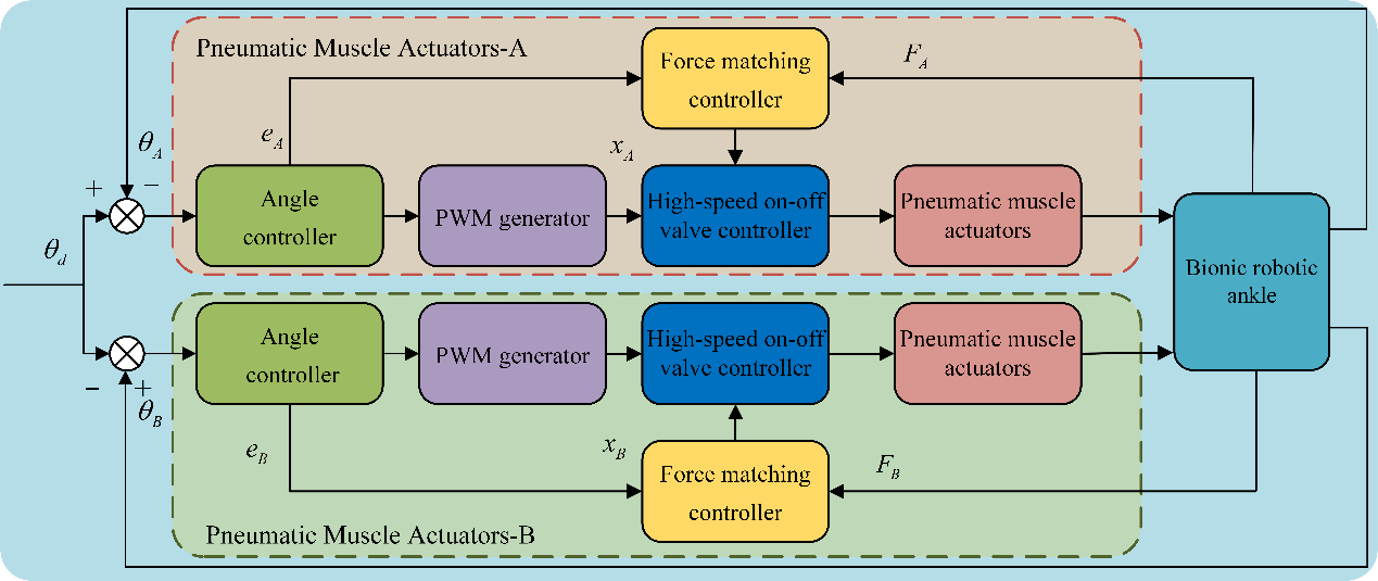 研究表明,该仿生踝关节可以实现多种不同气动肌肉输出组合,增加了负载匹配范围。同时,多气动肌肉型关节可以根据负载变化实现实时匹配输出,尤其在大负载范围,相比传统气动肌肉关节具有良好的角度跟踪性能。以上研究成果在推动穿戴式机器人、智能人形机器人的理论研究与实用发展方面具有重要意义。